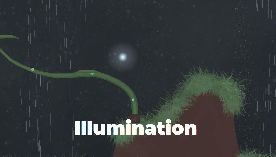 Illumination was apart of RIT's Jam for Hope weekend long game jam; the event was a wish for a current RIT student living with cancer alongside the Dear Jack Foundation.The game's idea is that even though you're small, your light still has a huge impact on the world around you. Use your light to make plants grow and platform to the top. You can light many different things such as a spotlight, potted plant, brazier, and a candle inside of a lantern.For this project, I was the only artist. I created each level in 300 dpi and large scale resolutions to push myself to my artistic limit. I also worked on learning Godot's language based off Python; I worked on the lantern, cave transportation, and helped with some bug fixing.